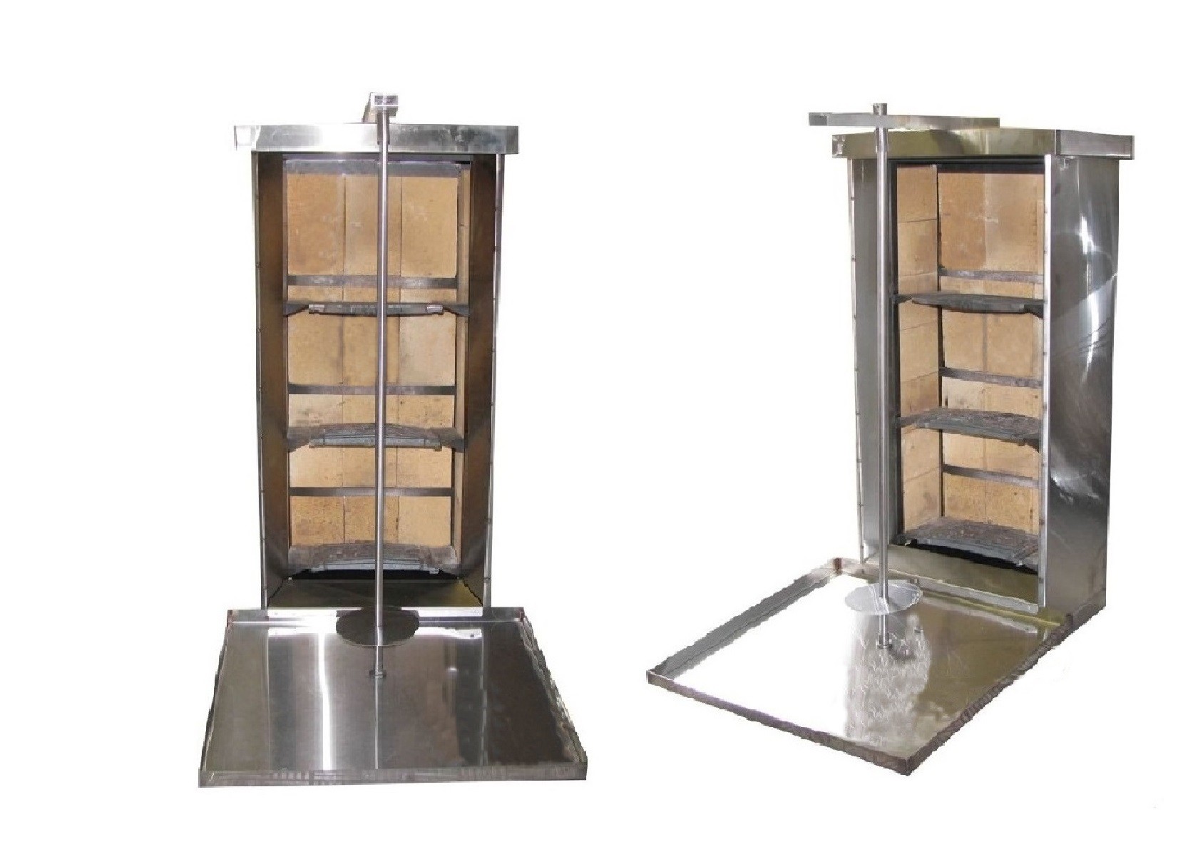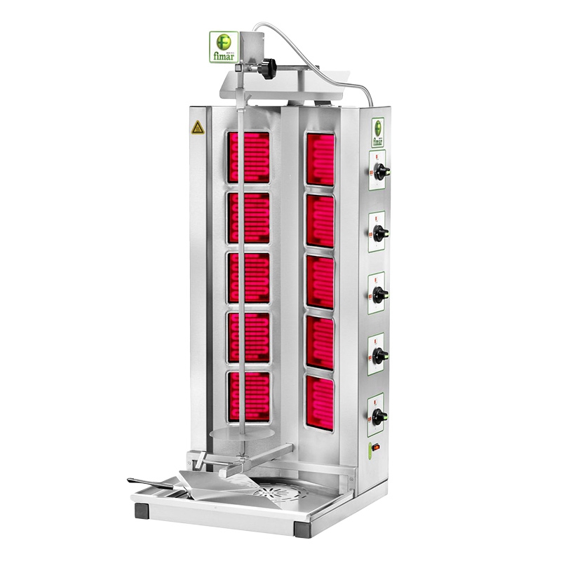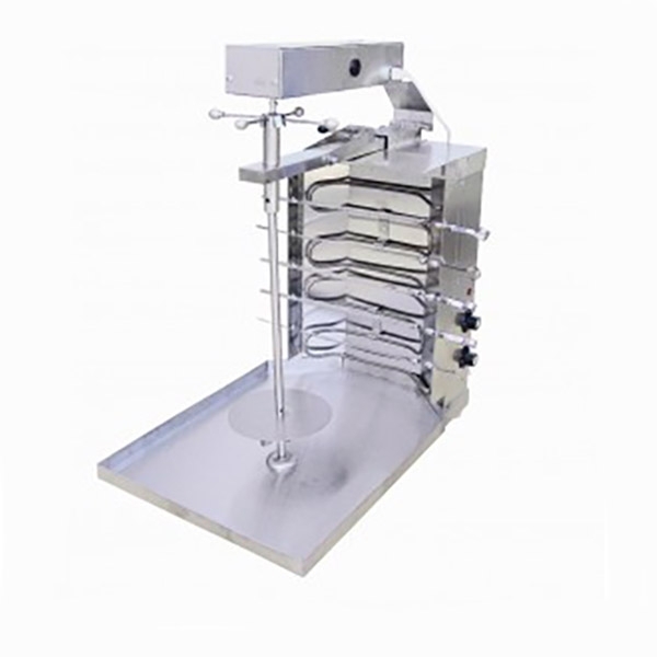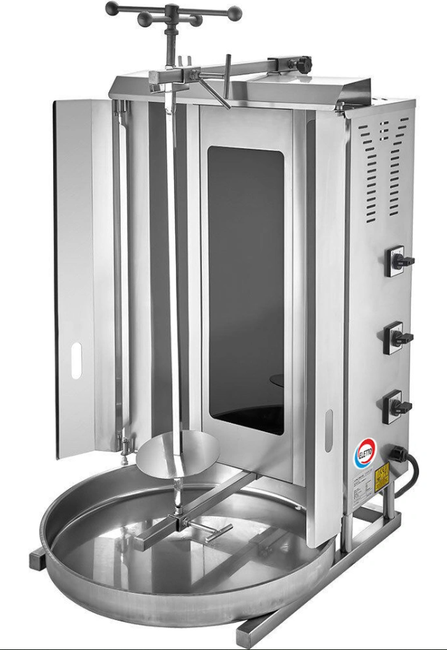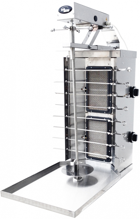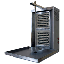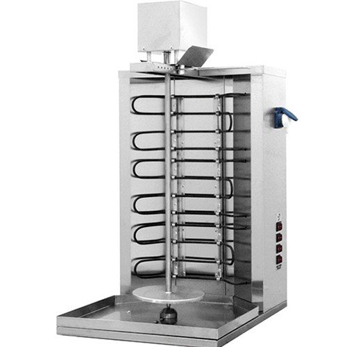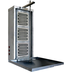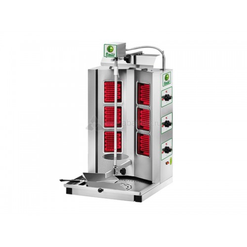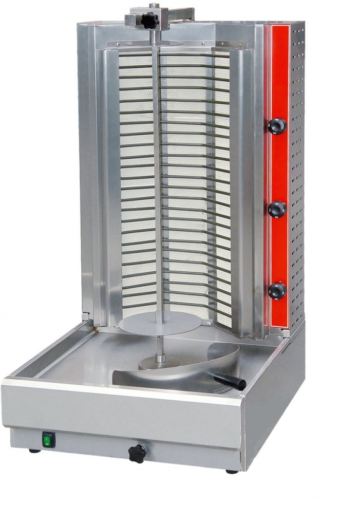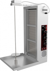 Вертикальная модель оснащена 3 зонами нагрева, автоматическим вращением вертела и жиросборником. Корпус выполнен из нержавеющей стали.