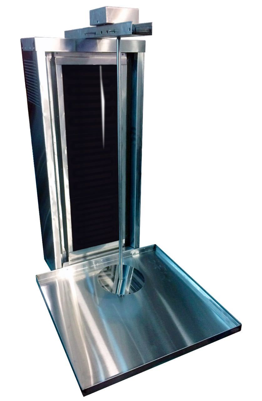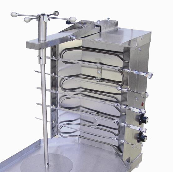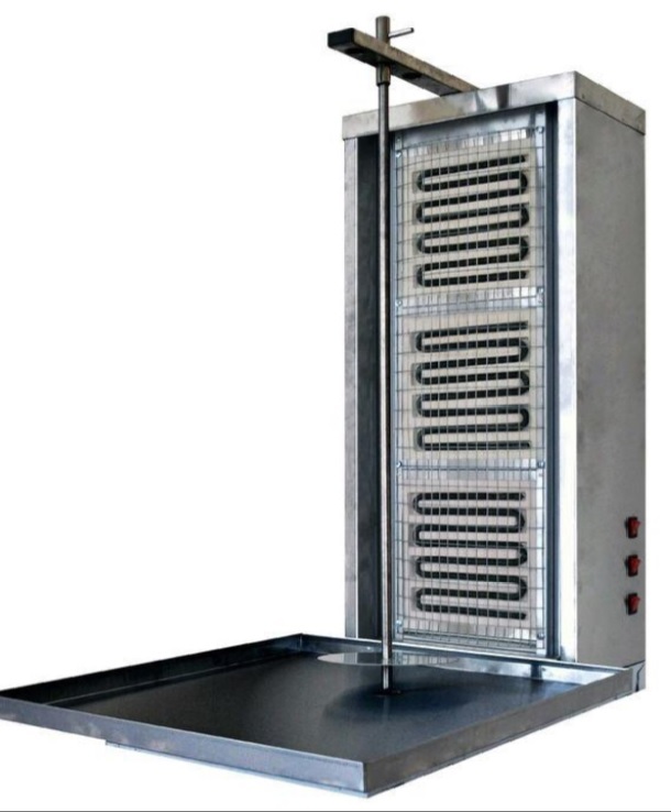 Особенности • Приготовление нарезки выполняется по средствам 3-х электронагревательных элементов, механизм изменения нагрева, представлен, термостойкими выключателями. • Изделие изготовлено из пищевой нержавеющей стали. • Вращение шампура осуществляется вручную. • Шампур имеет регулировку высоты под мясо до 740 мм и регулировку расстояния до нагревательных спиралей. • Большие габариты и непревзойдённый потенциал - идеальное решение открыть уличную торговую точку и выдержать наплыв большого количества посетителей.